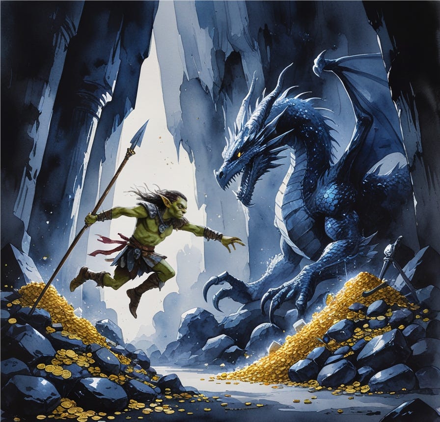 Grizzle chose movement. Chose madness. With a shout, he sprinted up the path, the dragon’s breath scorching the air mere feet away. In a desperate bid, he hurled himself off the ledge, spear poised.